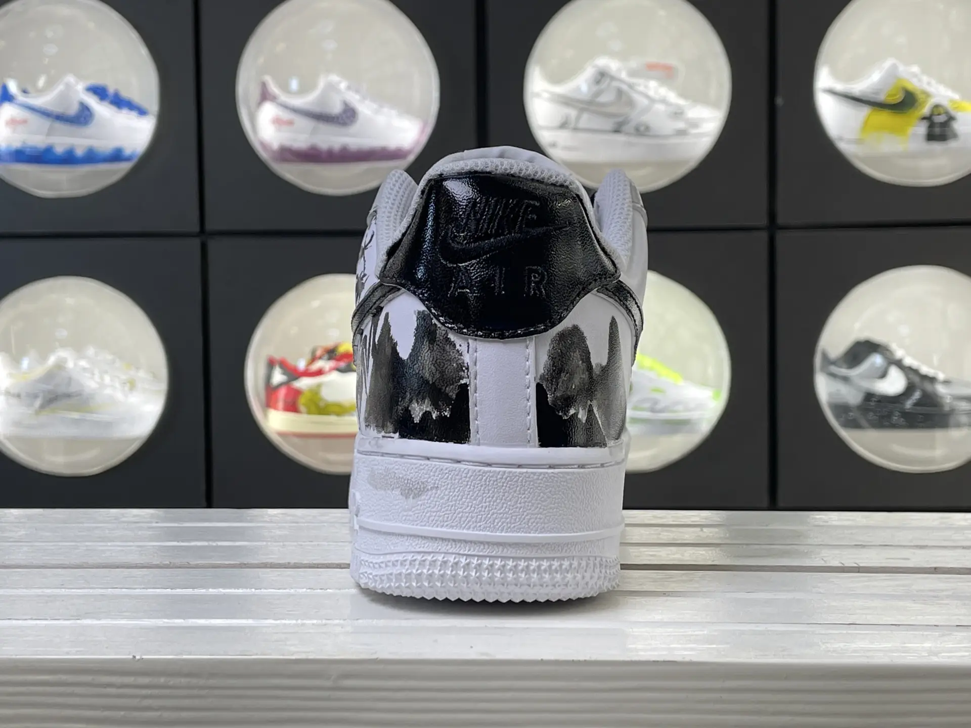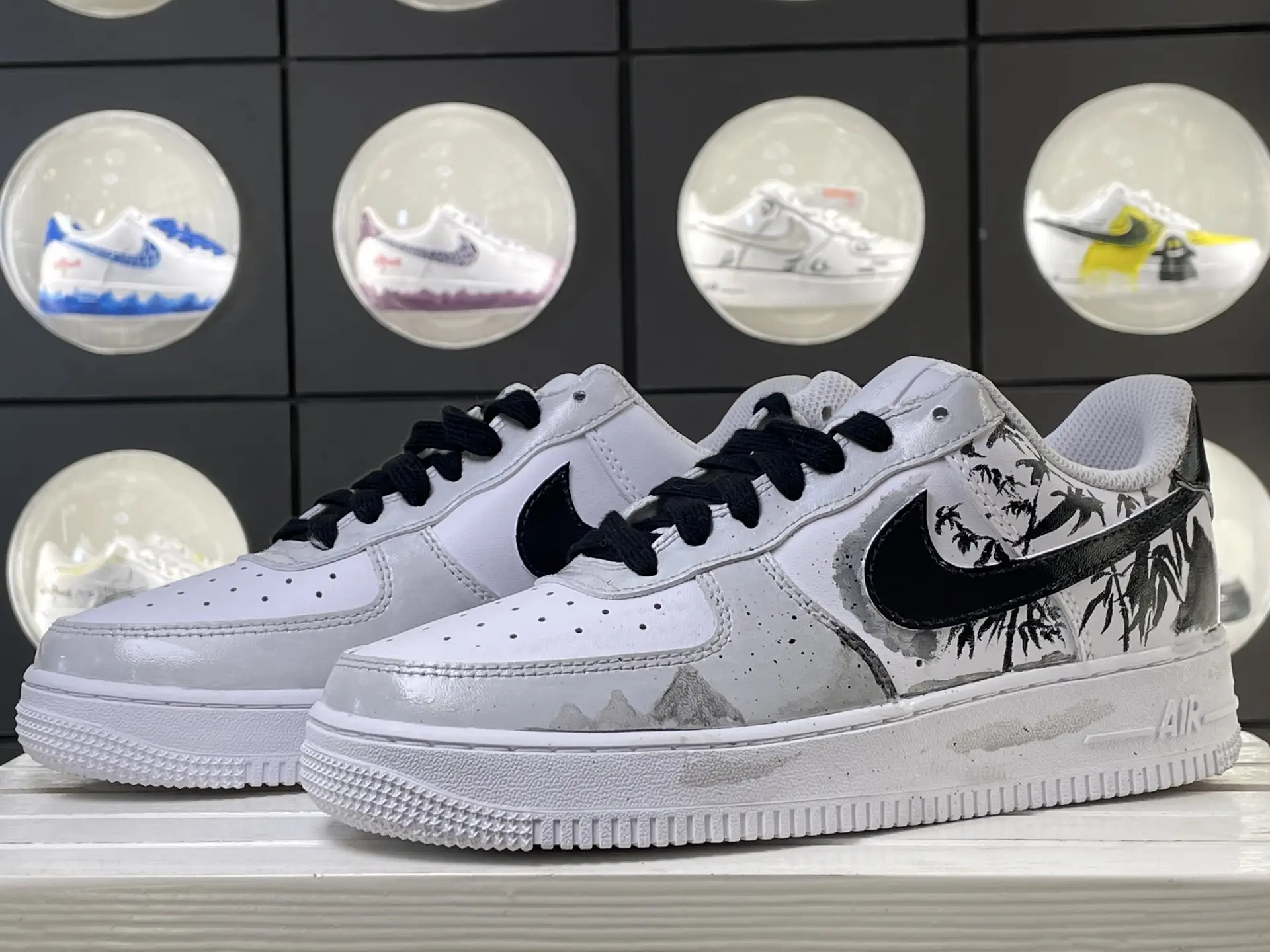 Classic Air Force 1 shoe design, versatile and fashionable. The shoe upper is mainly white, paired with black shoelaces, simple and atmospheric. The ink painting pattern on the shoe side is the finishing touch, with vivid elements such as ink bamboo and mountains, showcasing the oriental charm.