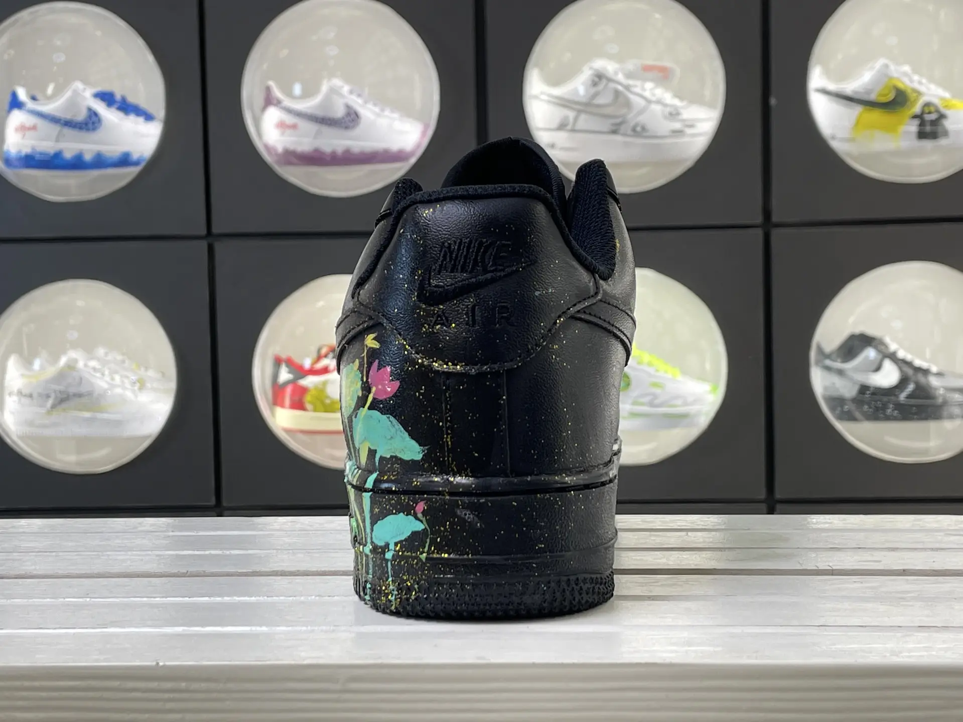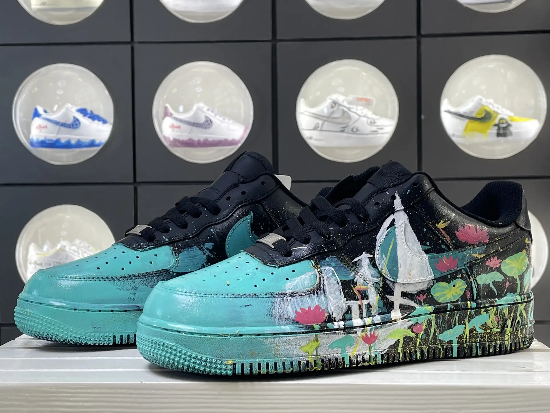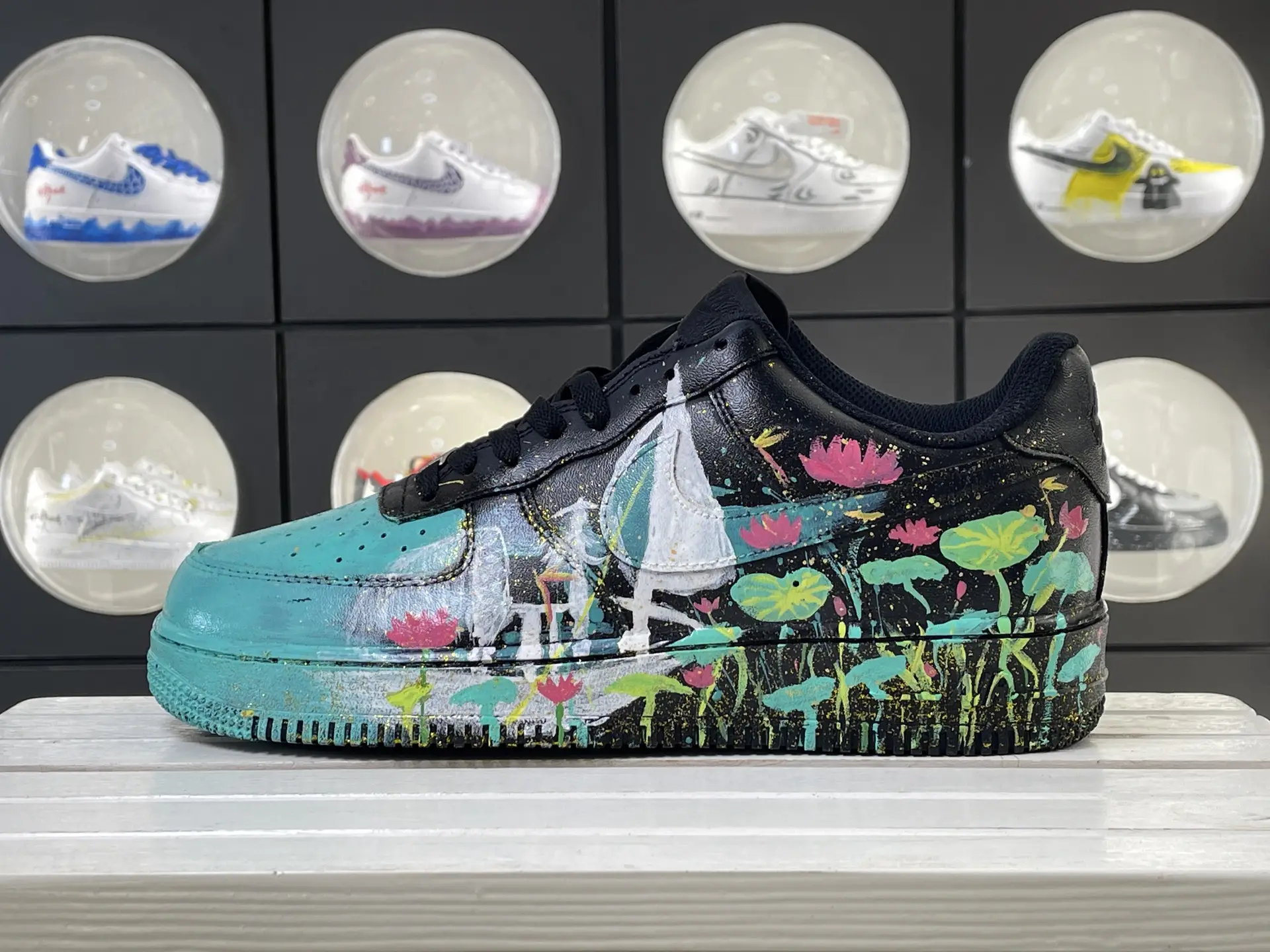 Classic Air Force 1 shoe design, fashionable and versatile, never outdated. The toe and lower part of the shoe are in a fresh lake blue color, while the upper part is a steady black color with a natural color transition. The Chinese style patterns painted on the shoe body are stunning, with lifelike lotus and lotus leaves, and leisurely character images, as if a dynamic ink painting is spreading under the feet.