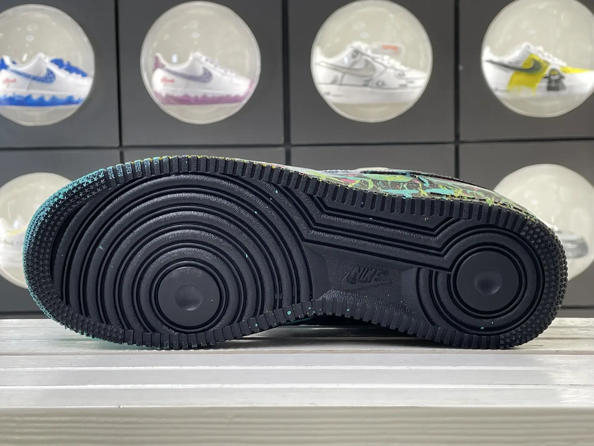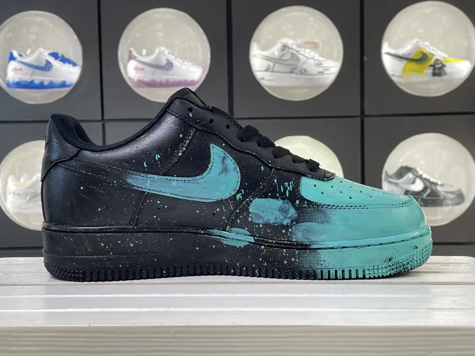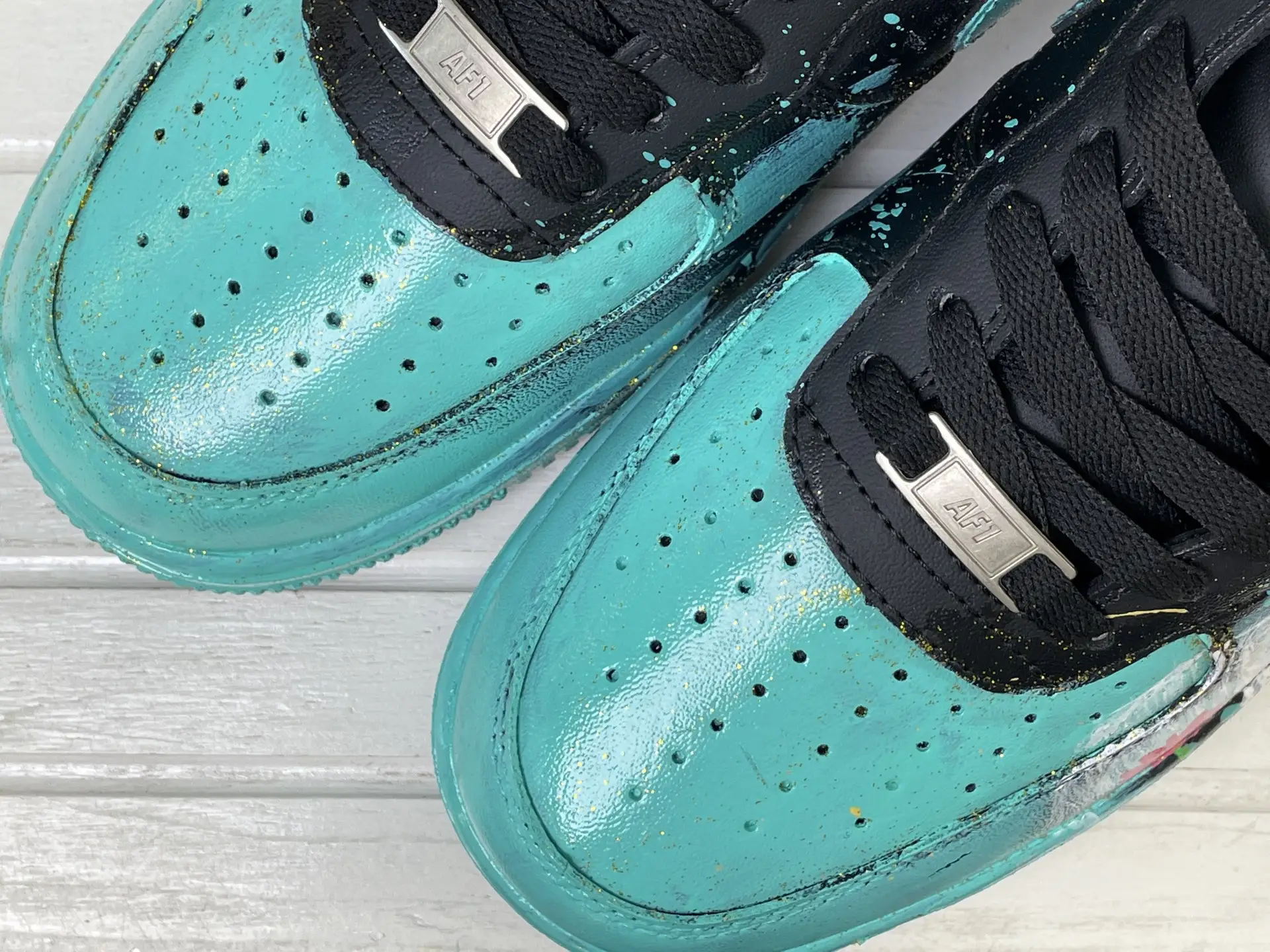 Classic Air Force 1 shoe design, fashionable and versatile, never outdated. The toe and lower part of the shoe are in a fresh lake blue color, while the upper part is a steady black color with a natural color transition. The Chinese style patterns painted on the shoe body are stunning, with lifelike lotus and lotus leaves, and leisurely character images, as if a dynamic ink painting is spreading under the feet.